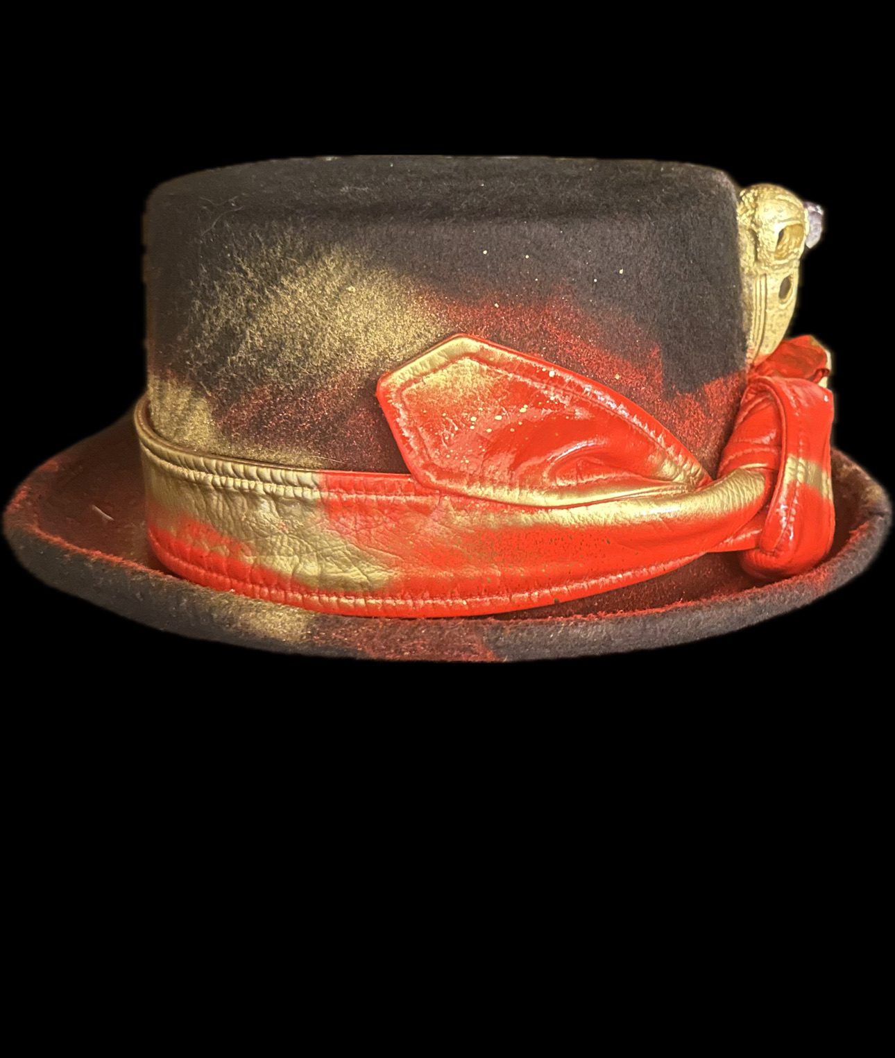 This top hat is just a cool, fun piece. The center piece is a narrow and slender gold bird skull- giving prehistoric vibes. The center eye is a restrained, yet elegant Amethyst Tear Drop. The vibrant red and gold leather brings it all together. Be a stand out with this one!